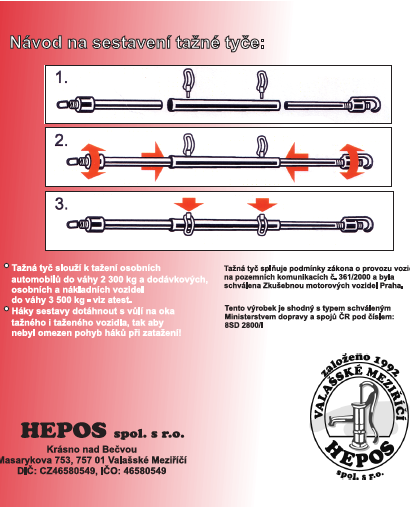 Certifikovaná tažná tyč pro odtahy motorových vozidel do hmotnosti 3500kg Tažná tyč určená k bezpečnému vlečení vozu Tento výrobek je shodný s typem schváleným Ministerstvem dopravy a spojů ČR č. 8SD 2800/III., odpovídá Zákonu o provozu na pozemních komunikacích a byl testován státní zkušebnou. Délka 1820 mm v rozloženém stavu,